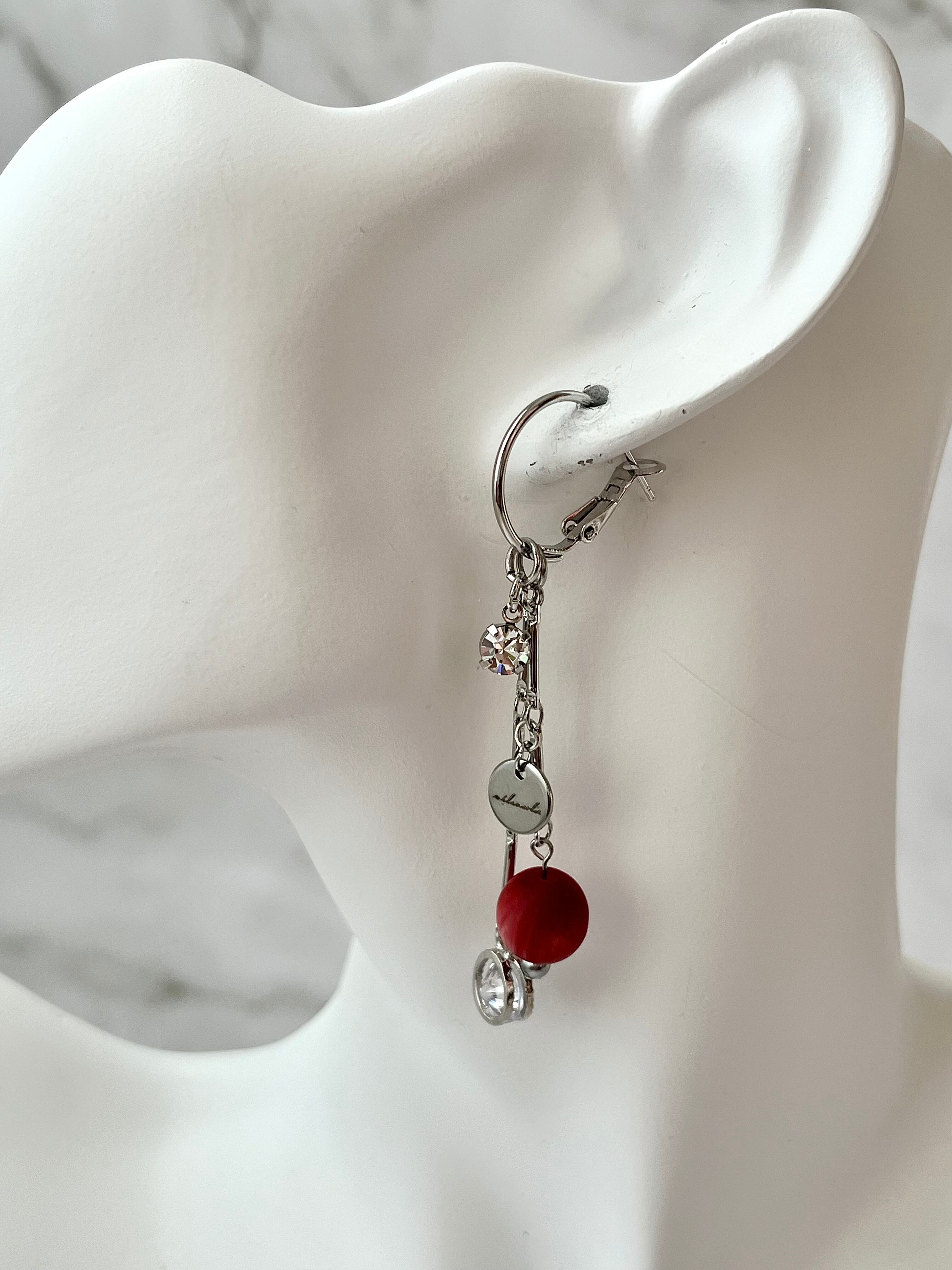 ガラスビーズやアクセントの赤いビーズをゆらゆらと飾った耳飾りです。