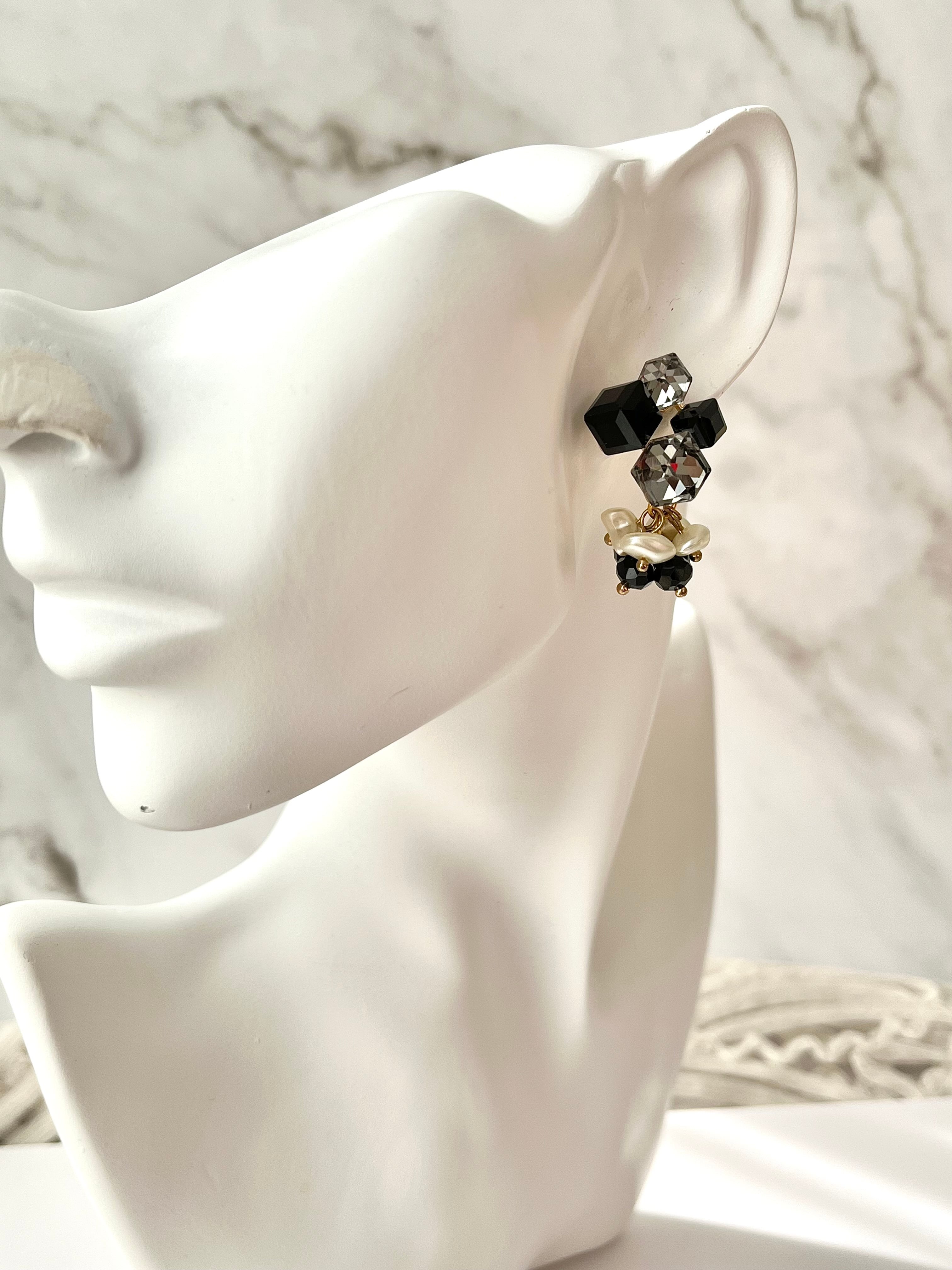 立体的なスクエアが大小並んでいるめずらしいピアス金具に、モノトーンのビーズをたっぷりとあしらったピアスです。