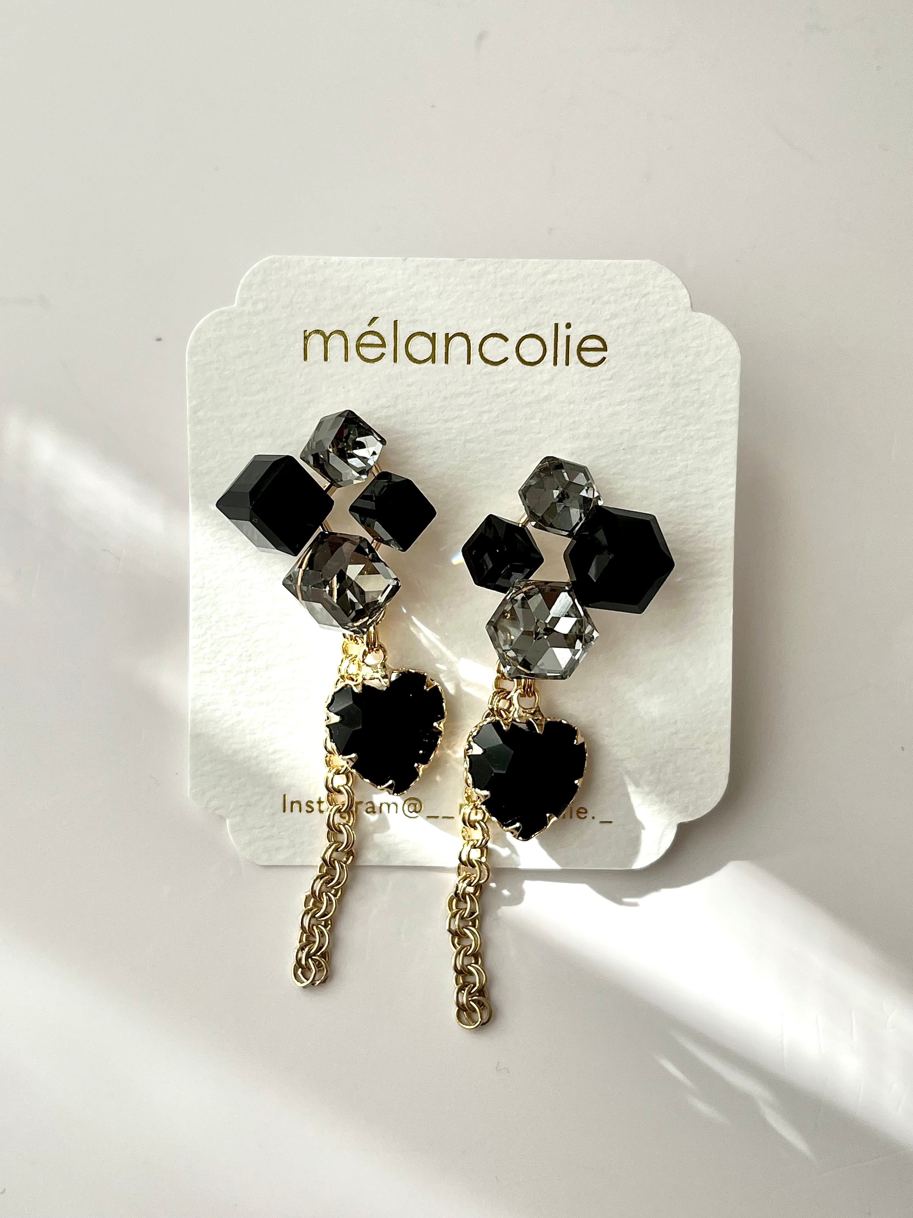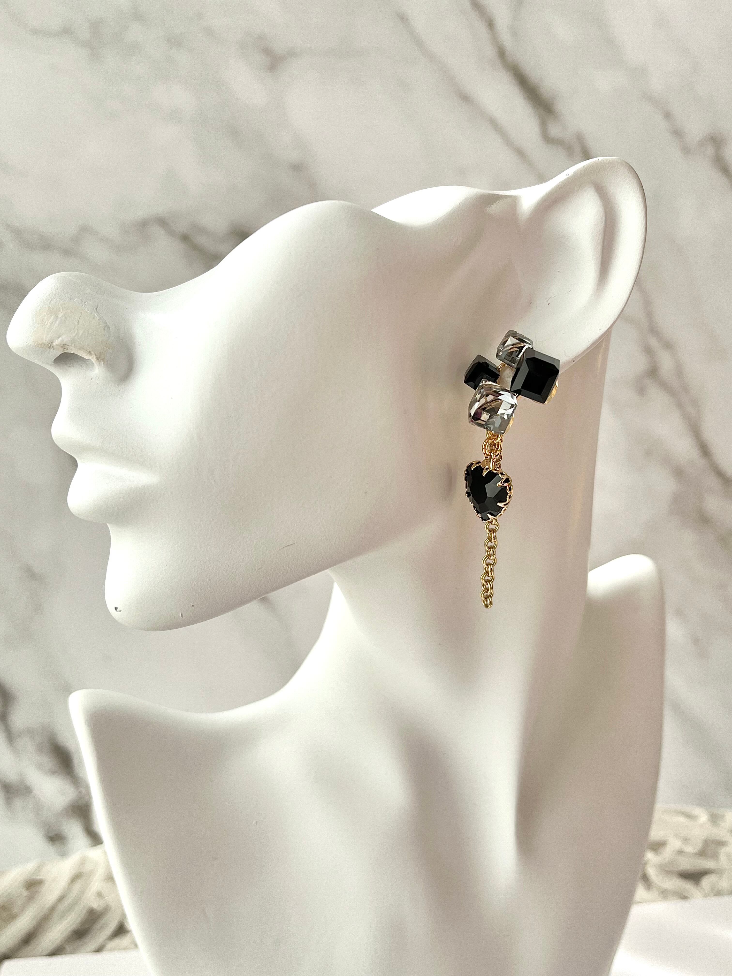 立体的なスクエアが大小並んでいるめずらしいピアス金具に、ブラックのハートとチェーンを組み合わせたピアスです。