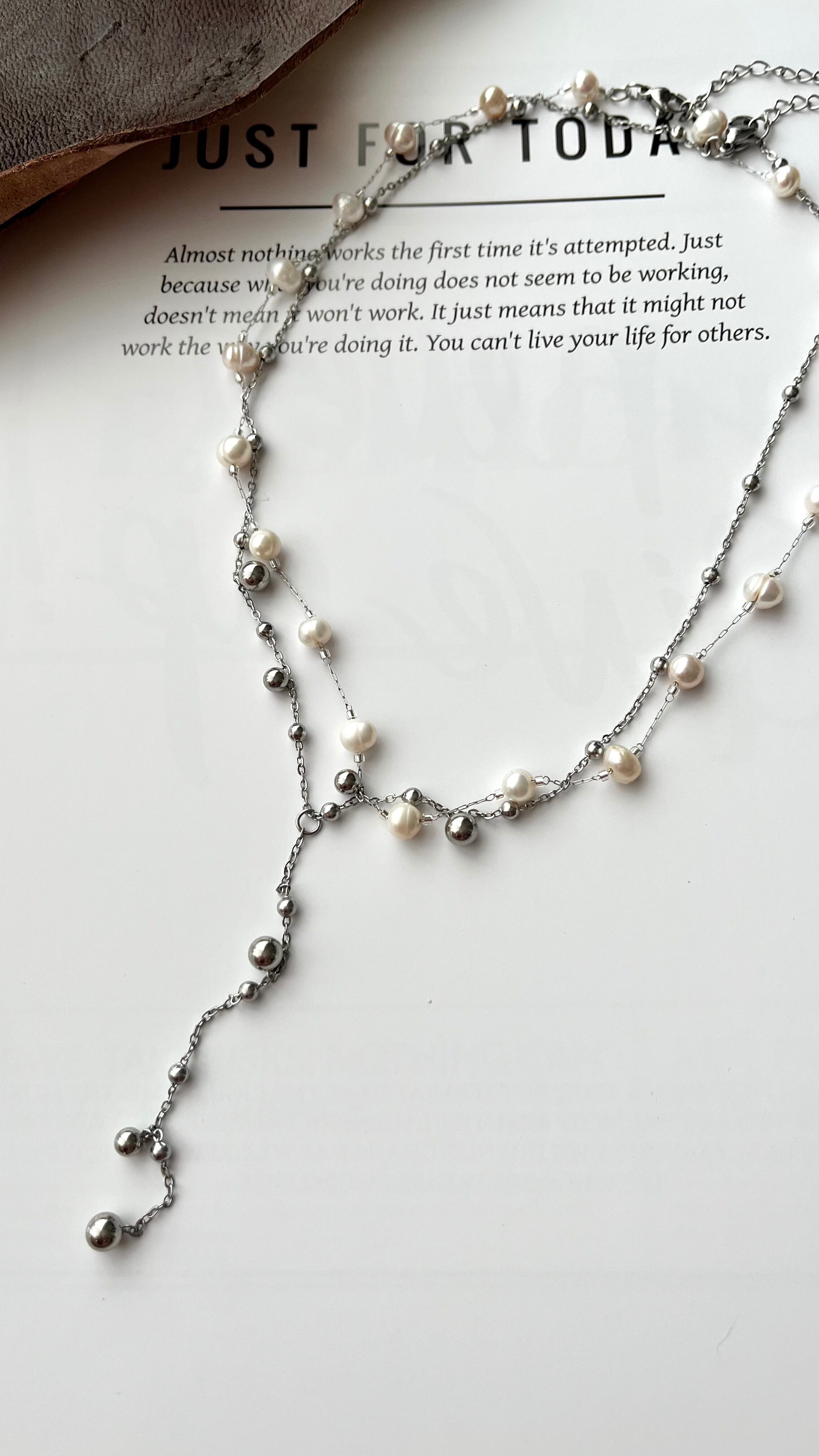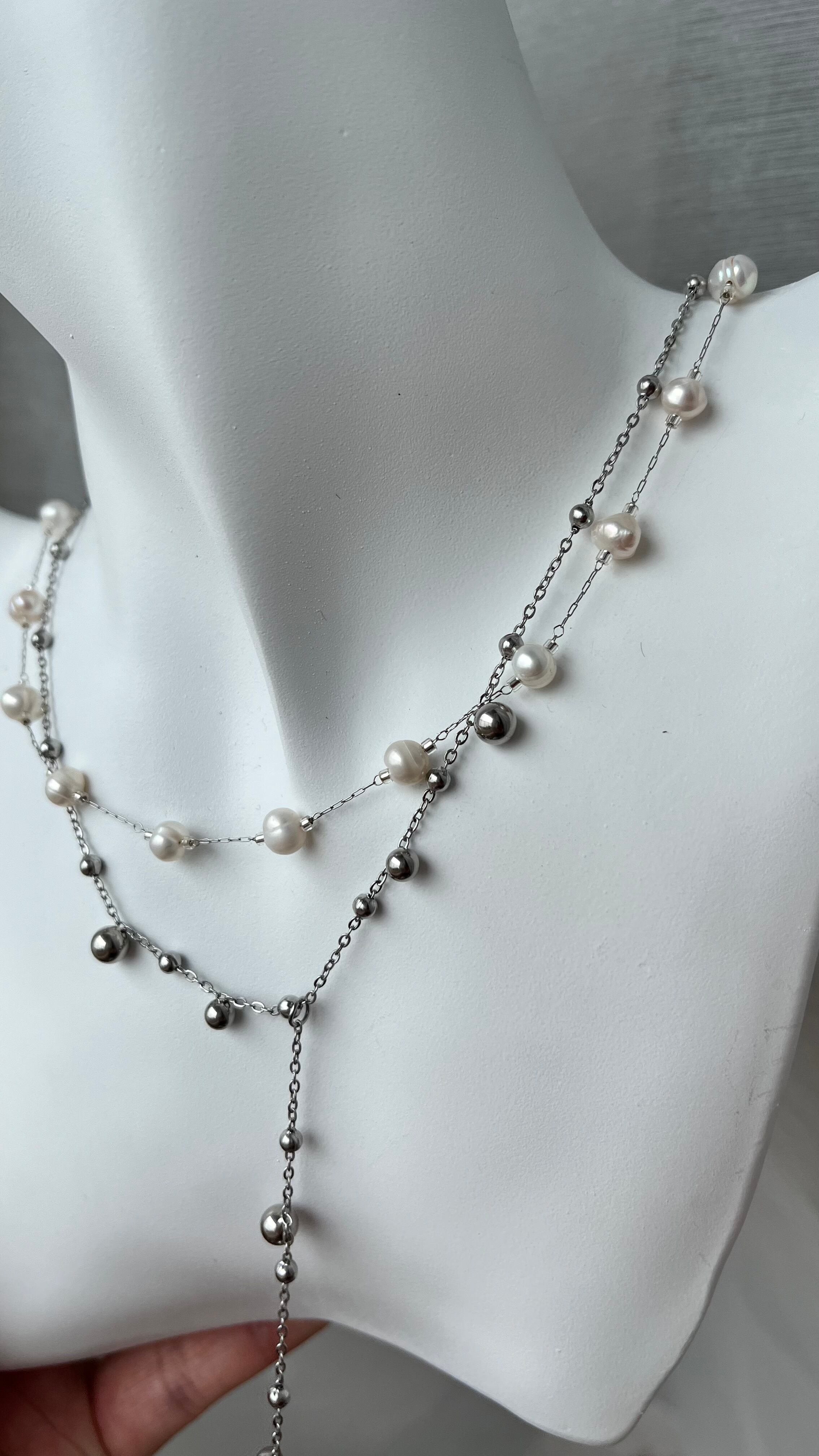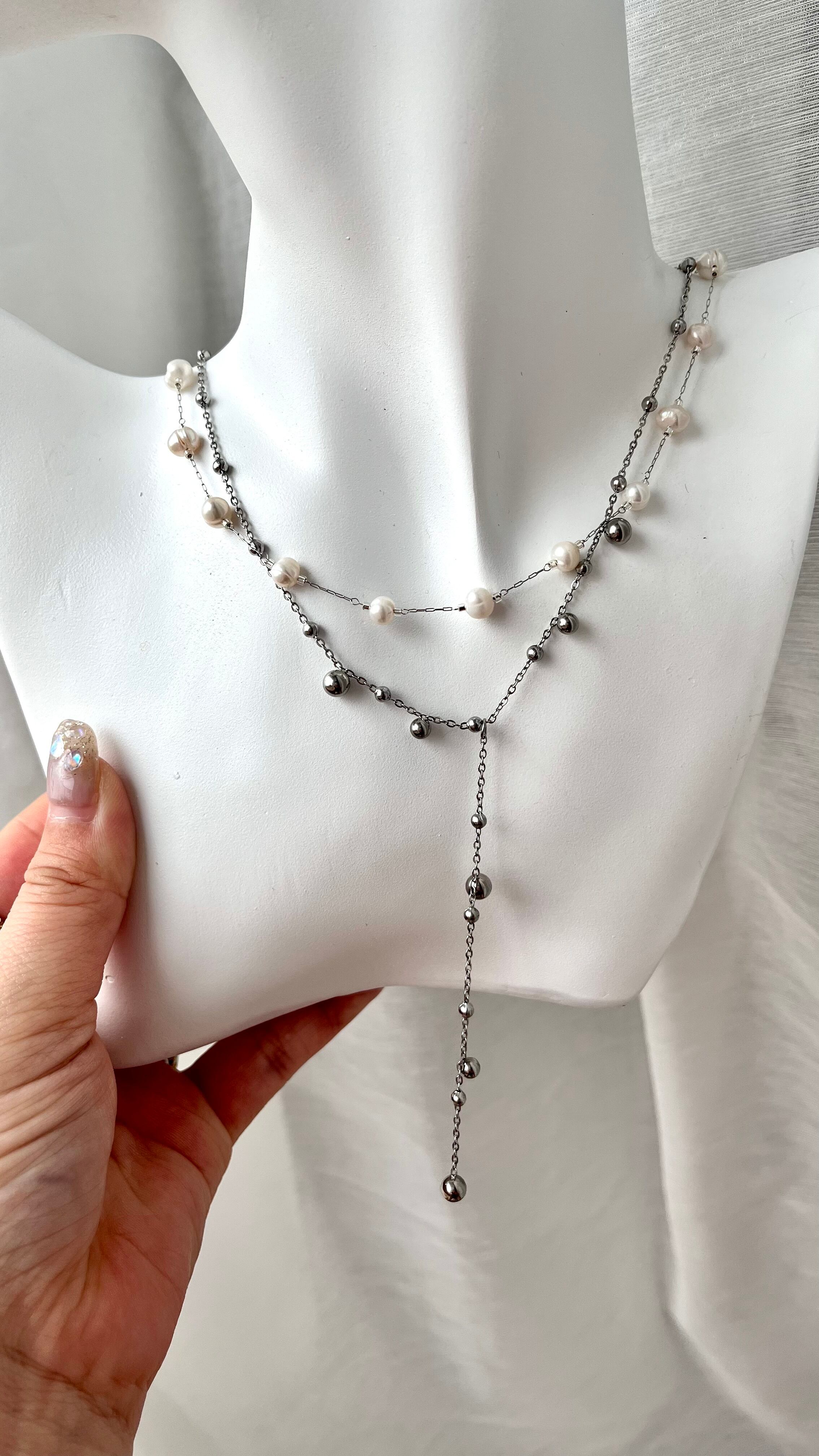 大きさの違うつぶつぶメタルがついたネックレスと、淡水パールがたっぷりついたネックレスをSETで合わせました。