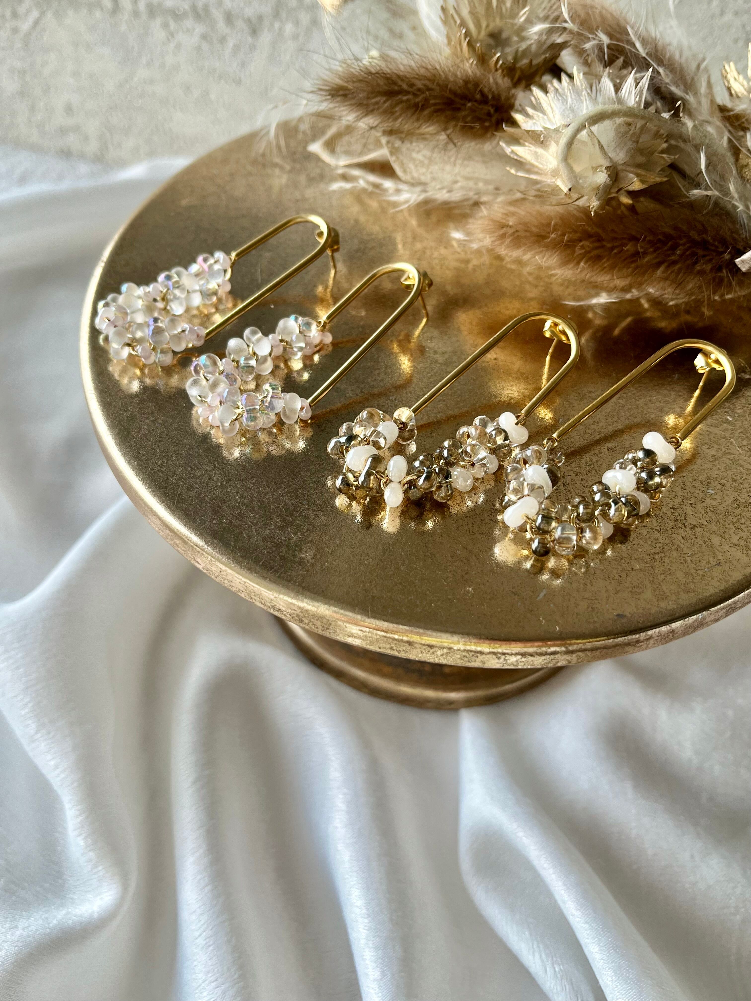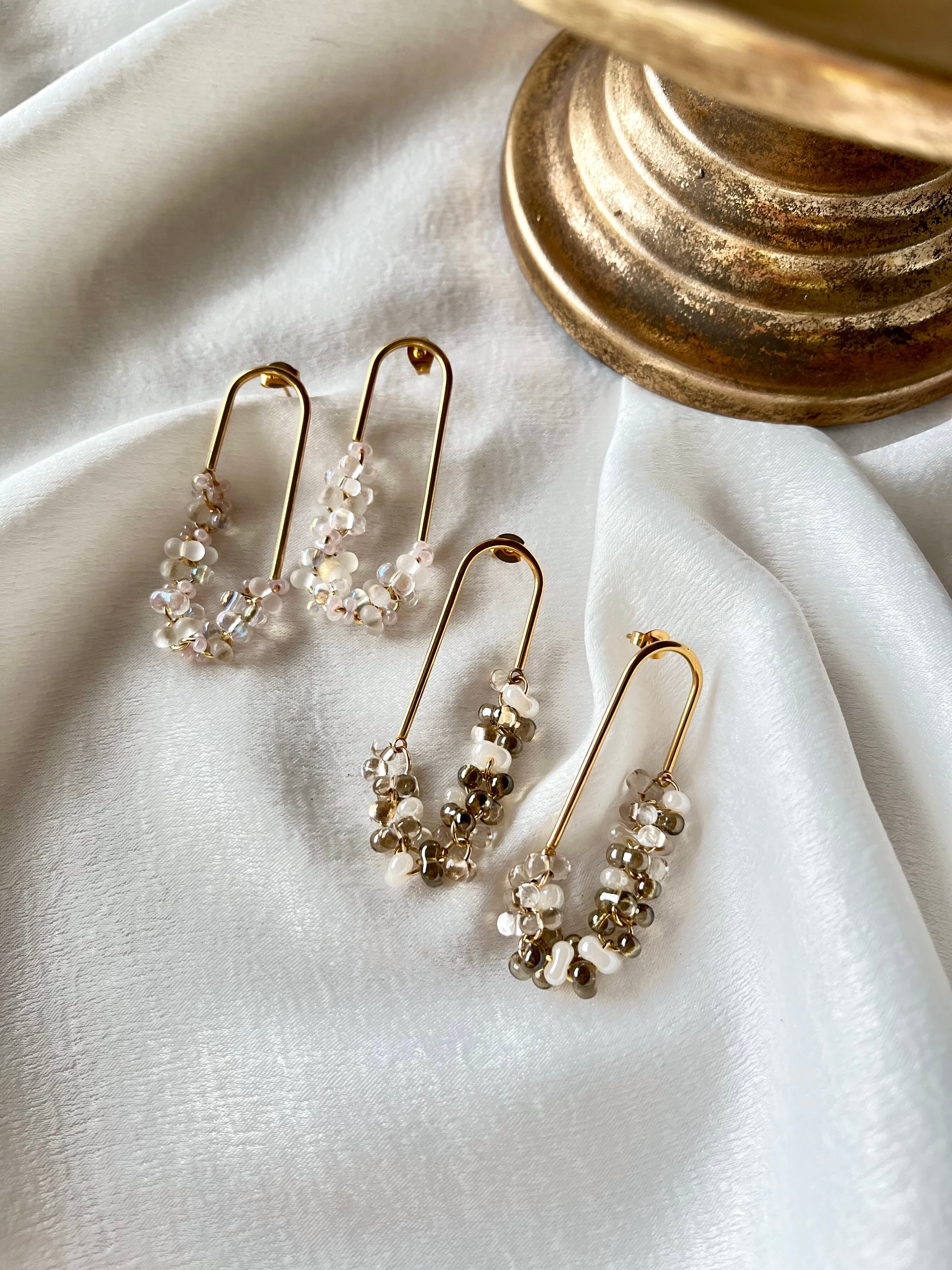 フリルビーズコネクトピアス(クリアスモーキーブラック×リネン)