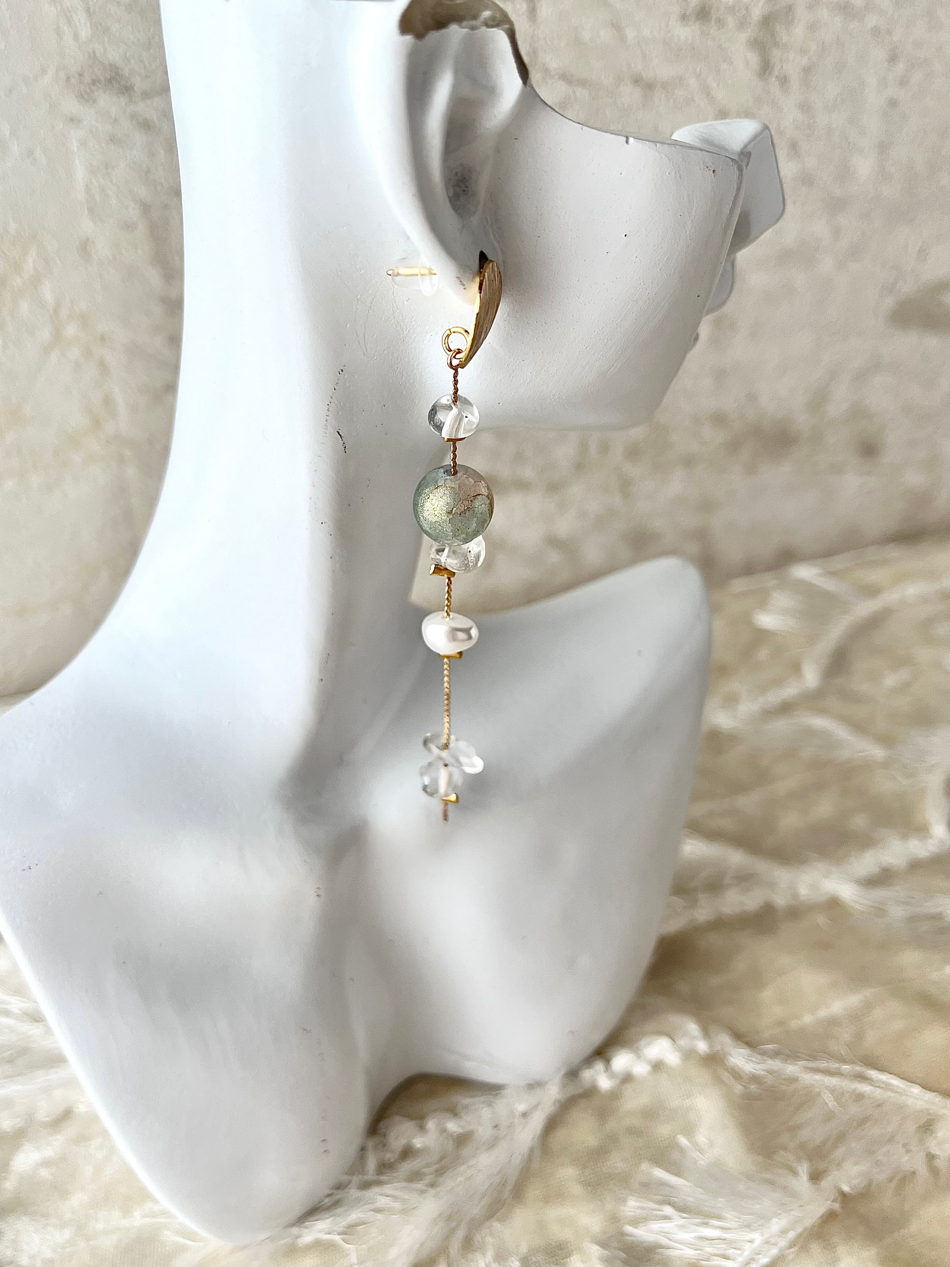 エメラルドグリーンにホワイトやゴールドのカラーが細かく入り交じった綺麗なビーズと、