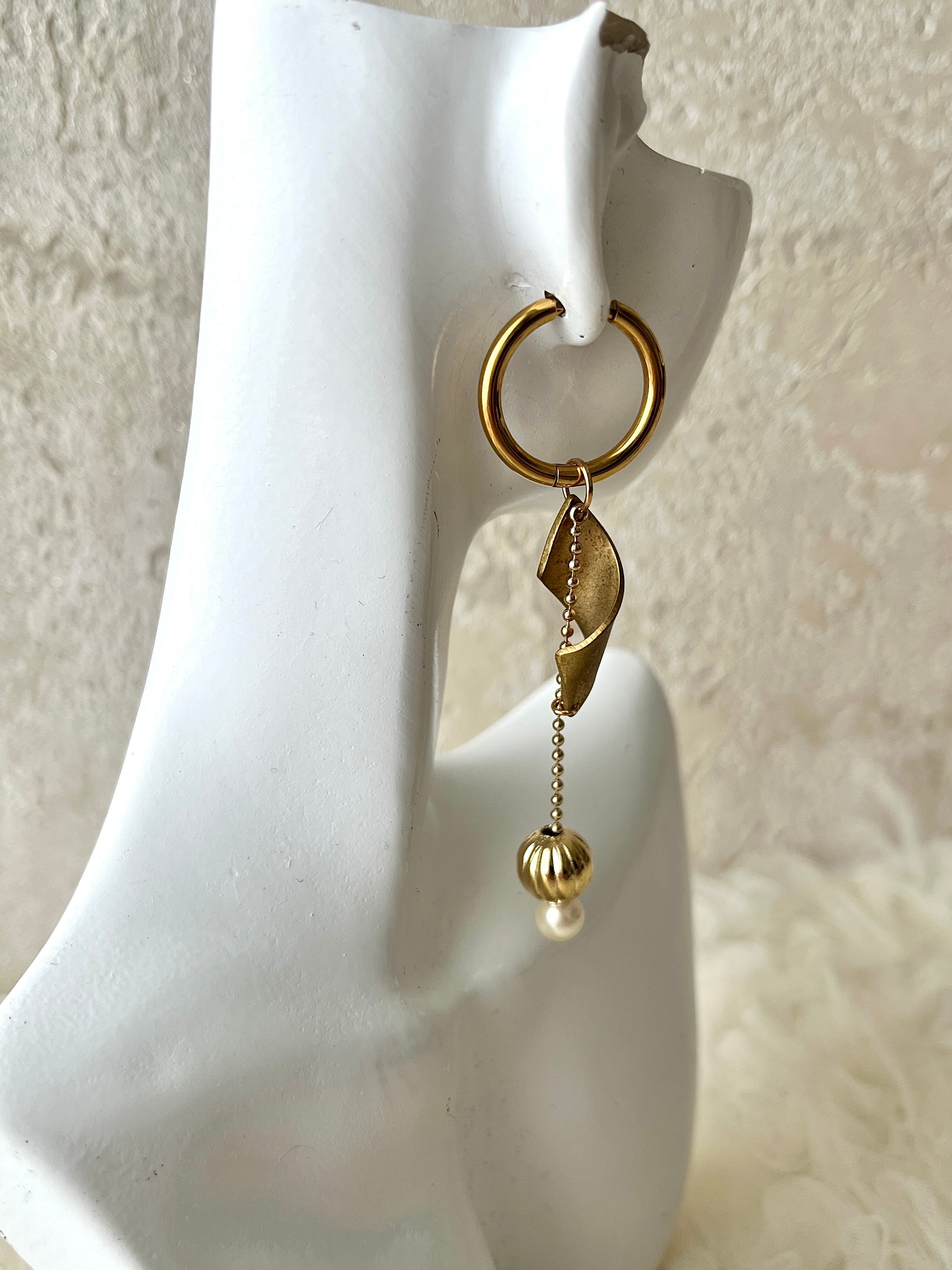 ピアス/ステンレス、真鍮、合金チェーン、ビンテージ丸玉、国産パール
